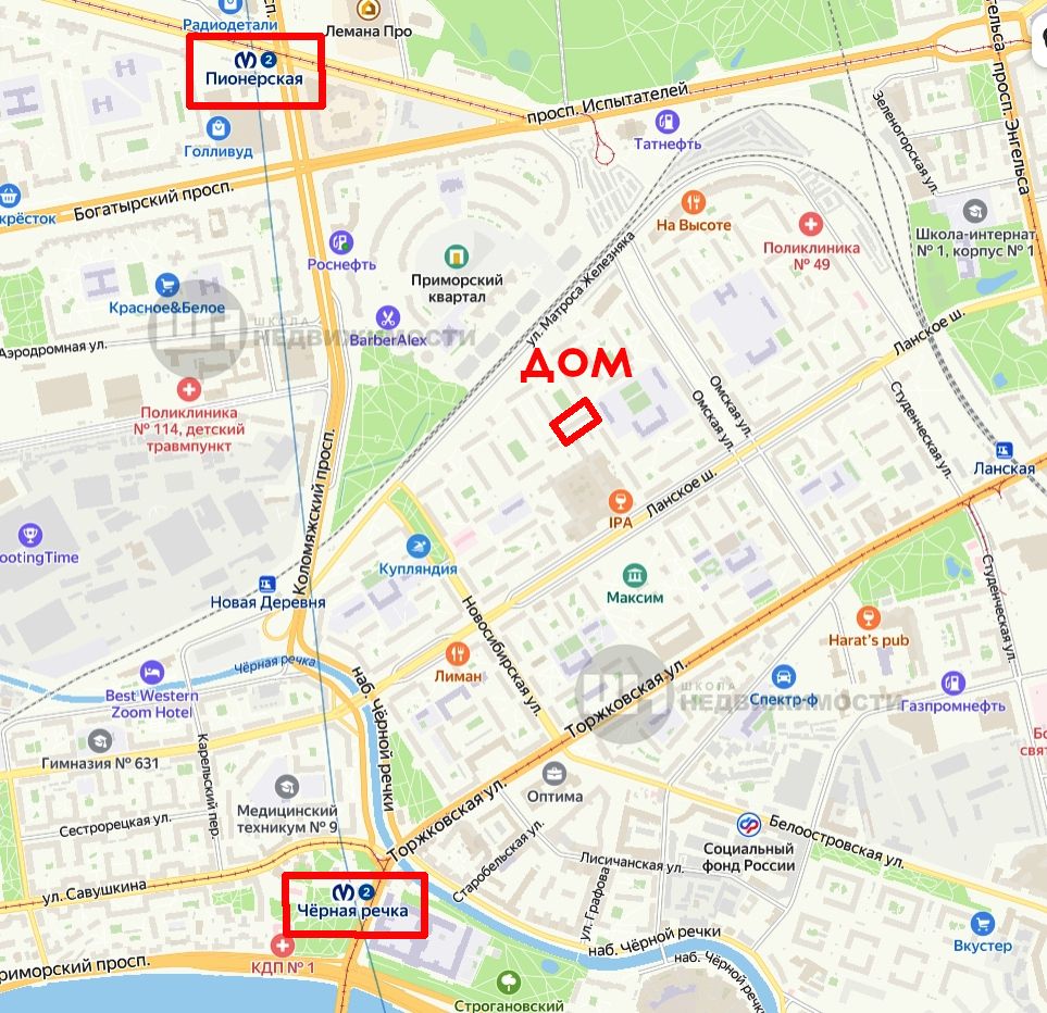 • До ближайшей станции метро "Чёрная речка" можно дойти пешком за 15 минут, до станции "Пионерская" за 20.