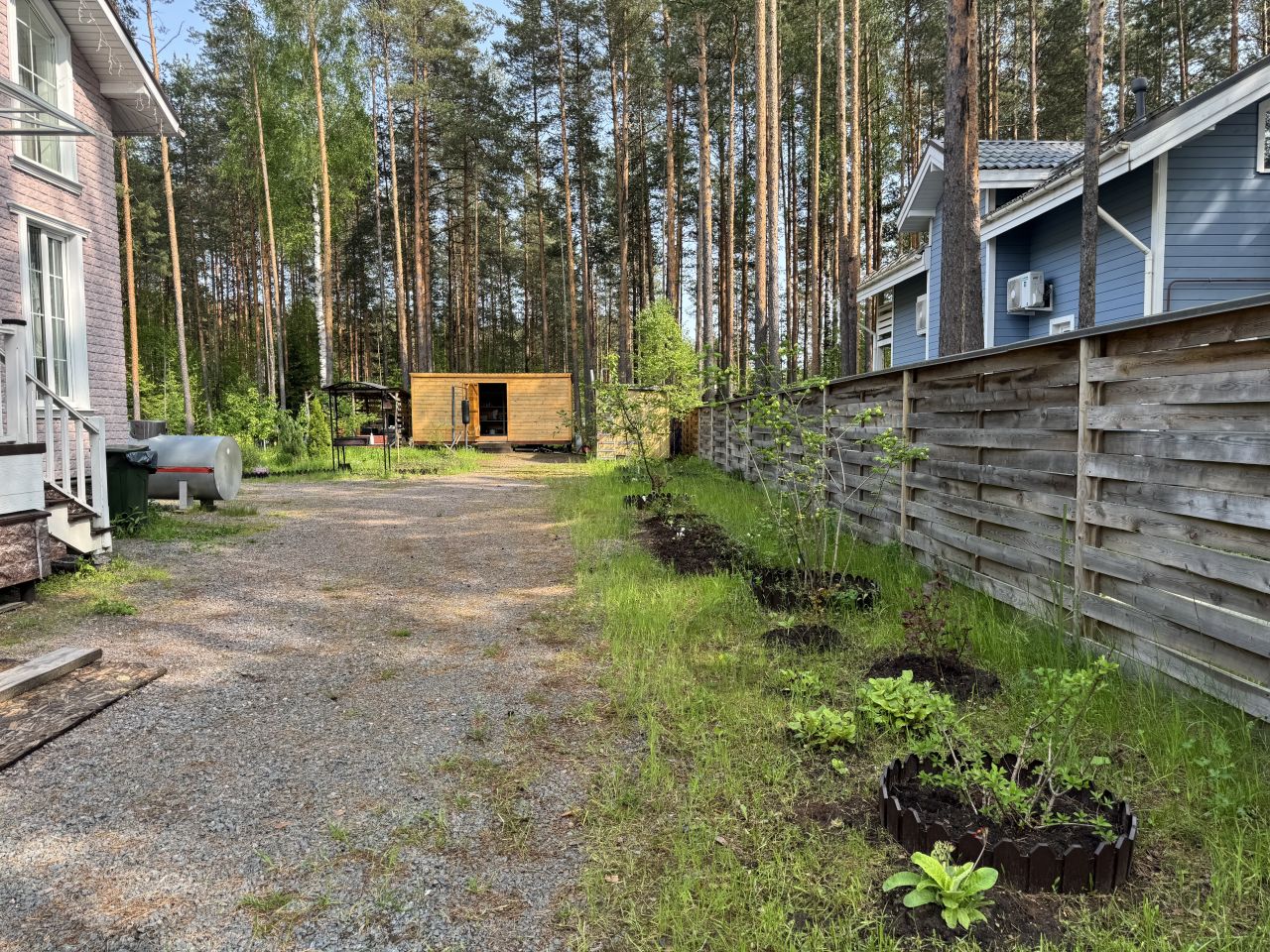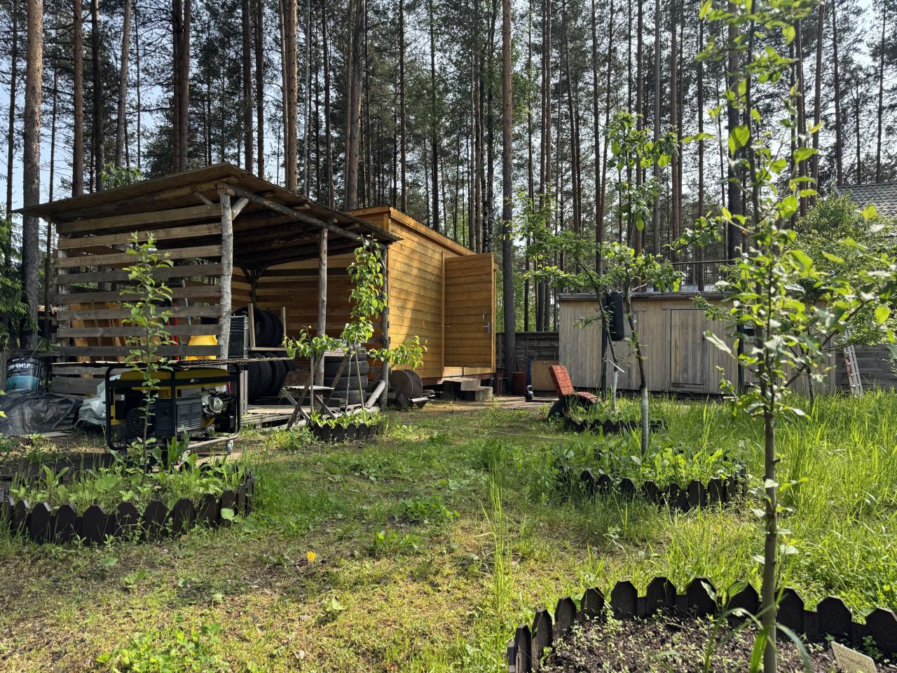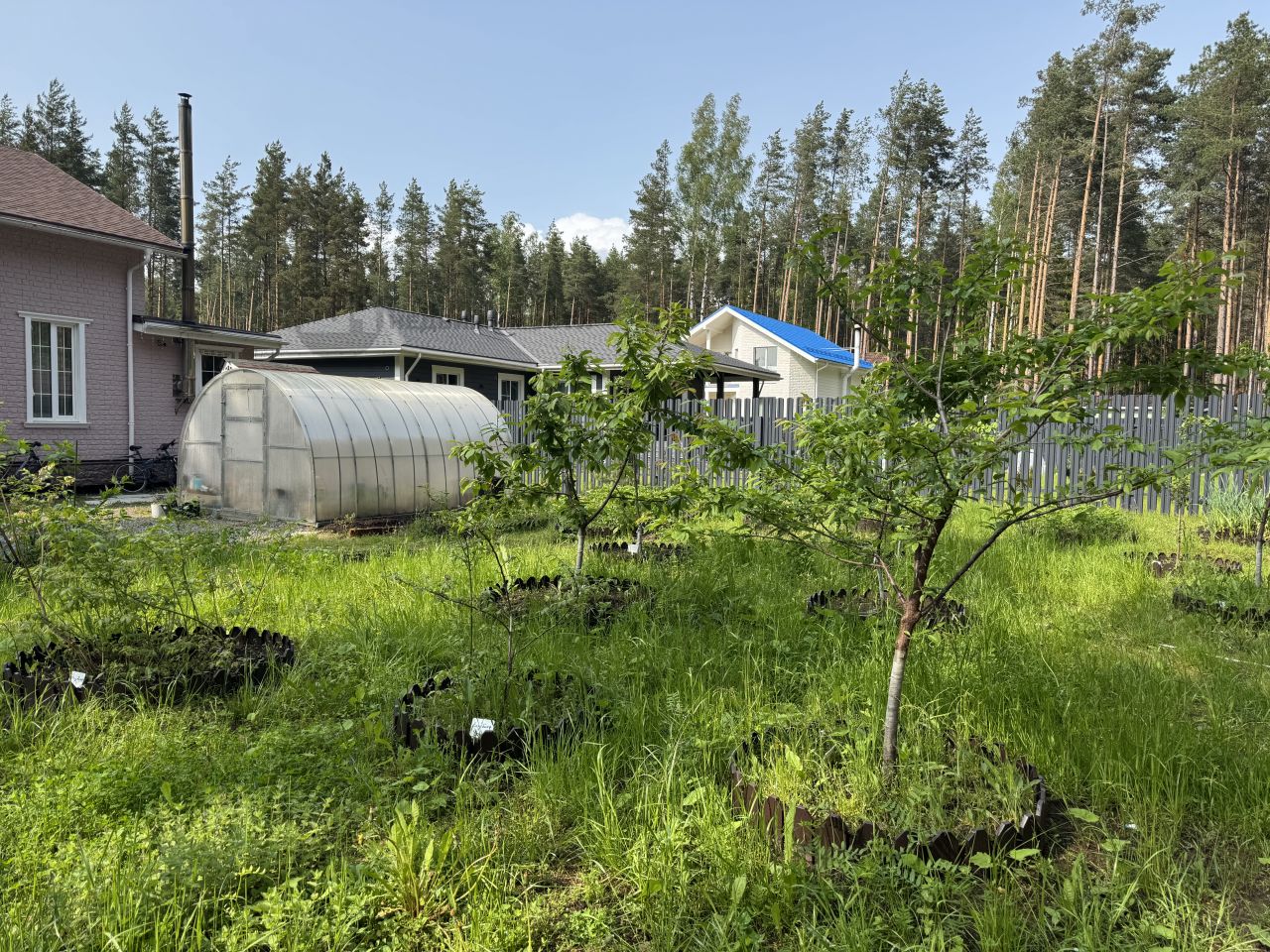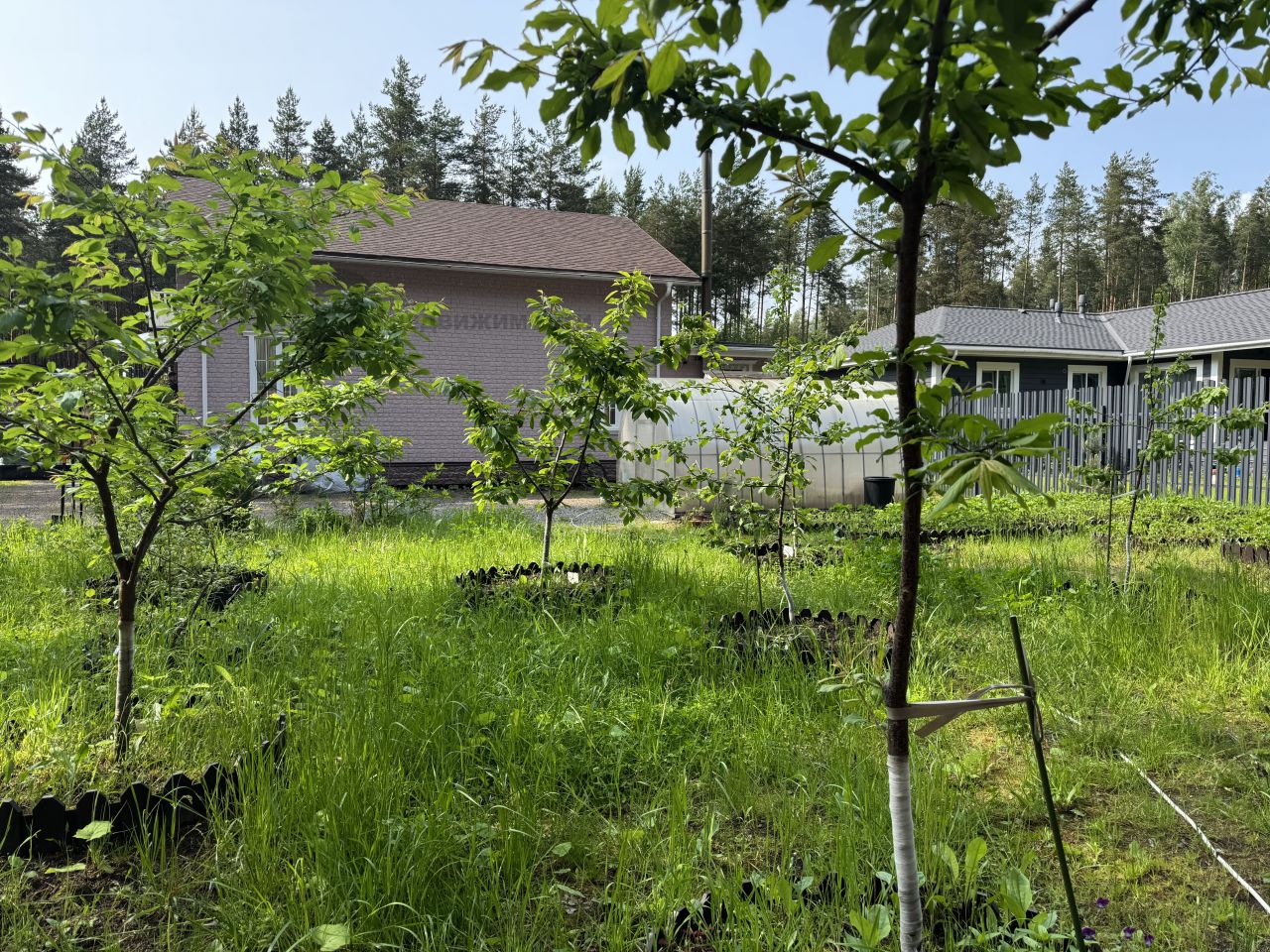 - На территории благоустроенного участка высажены молодые деревья и кусты, установлена теплица,