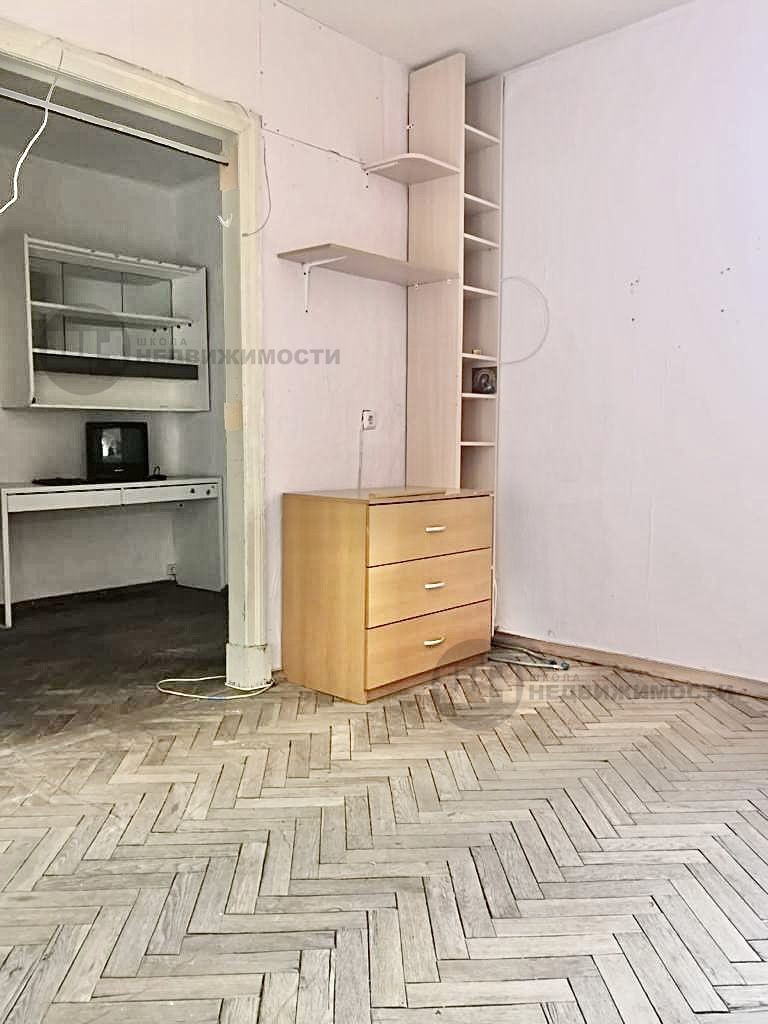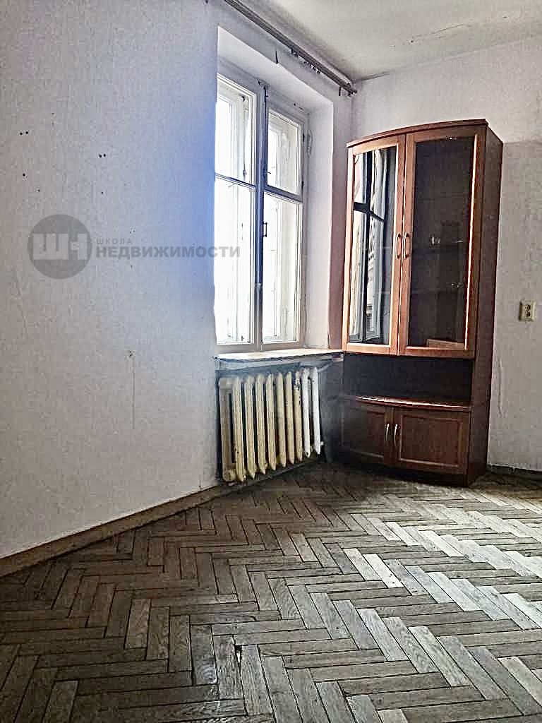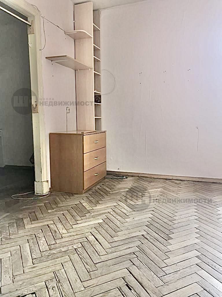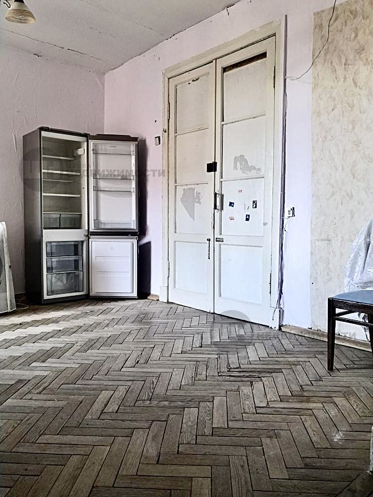 Пространство комнаты разделено на 2 части узаконенной перегородкой , что очень удобно для отделения спального места. Требуется ремонт . На полу лежит оригинальный паркет в хорошем состоянии. По договоренности к комнате относятся и две кладовые.