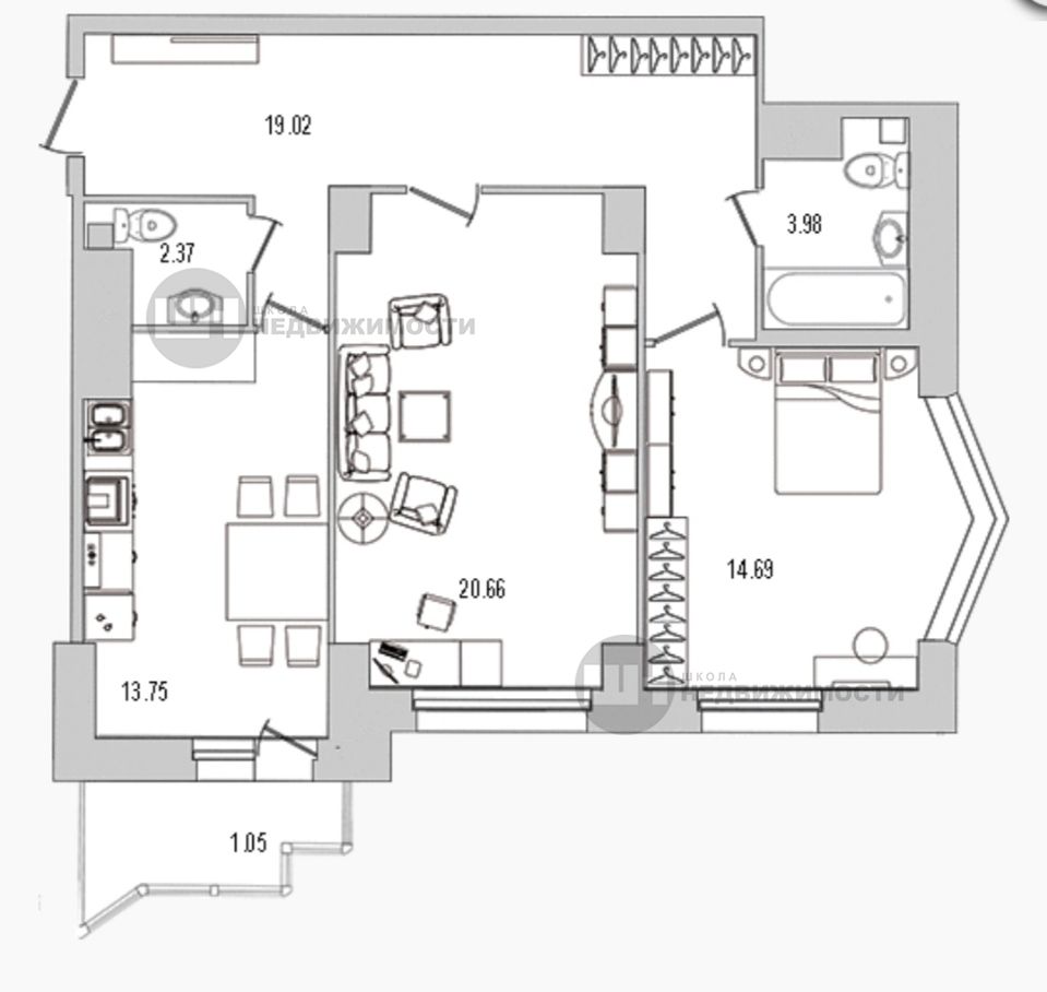 - Комнаты 20,5 + 13,9 (с эркером) м²