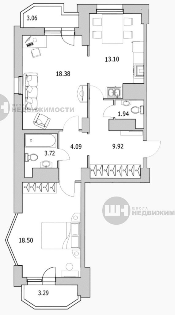 - Комнаты 18,6 + 18,7 (эркер) м²