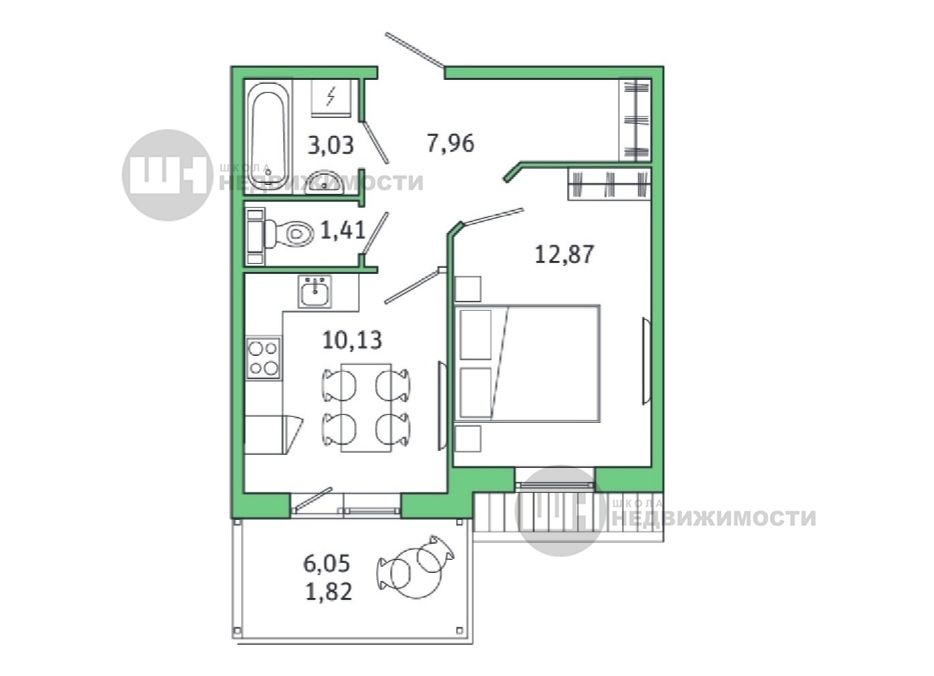 В продаже 1 комнатная квартира общей площадью 36,2 м²